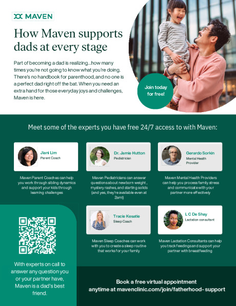 Maven is a digital family health platform that, through the AetnaⓇ Enhanced Maternity Program® with family-building and menopause provides free, 24/7 access to specialized virtual care, personalized guidance, trustworthy resources, and more. You and your partner get: