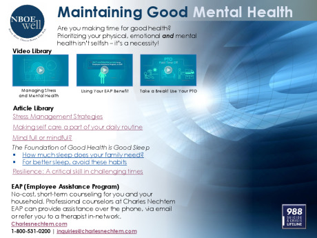 The Employee Assistance Program is a FREE benefit provided by NBOE to help you manage work/life problems and achieve a healthy work/life balance. Think of the EAP as your professional support system.